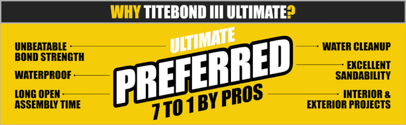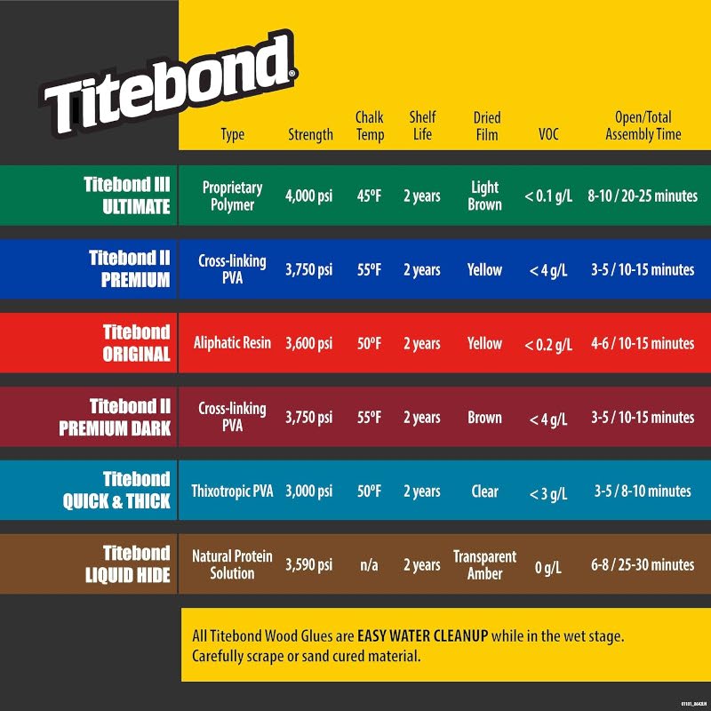 Titebond III Ultimate 木工用接着剤は、防水性が実証された初の1液型水洗い可能木工用接着剤です。防水仕様のTitebond IIIは、ANSI/HPVAタイプIの耐水性規格に適合し、優れた接着強度、長いオープンアセンブリー時間、低い塗布温度を実現します。無毒性、無溶剤で、水で洗浄できるため、従来の防水木工用接着剤よりも安全に使用できます。Titebond IIIは無毒性、無溶剤性で、水で安全に除去でき、従来の防水木工用接着剤よりも安全に使用できます。強力な初期接着力を実現し、柔らかくする必要なく簡単に研磨でき、食品との間接接触(まな板など)についてもFDAの承認を受けています。屋内/屋外両方での使用に最適な、究極の木工用接着剤です。