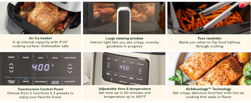 予熱不要の5種の調理機能付:エアフライ、ロースト、ベーク、ブロイル、保温